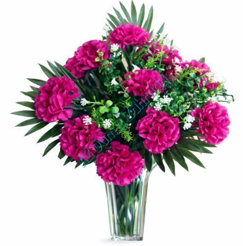 Pekná a bohatá kytica z tmavoružových karafiátov za výbornú cenu obsahuje 12 karafiátov zo zelenými listami. Kytica má výšku 50 cm a každá hlavička karafiátu má priemer 7 cm. Kytica sa môže použiť na hrob počas celého roku alebo ako dekorácia do vázy. Kytica z karafiátov sa dá ľahko ohýbať a tvarovať.
