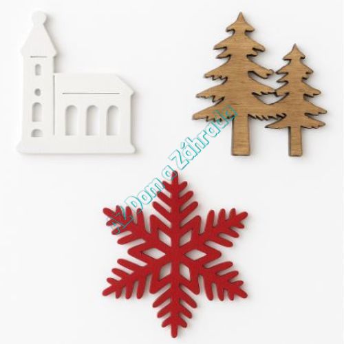 Sada drevených vianočných prízdob v krásnych kombináciách bielej, červenej a hnedej farby. Obsahuje spolu 12 kusov dekorácií v motívoch vločiek, stromčekov a domčeka, ktoré sú ideálne na výzdobu stromčeka, vencov, darčekov či kreatívne handmade projekty.
